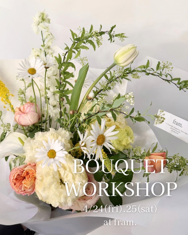 ブーケのワークショップを行います! どんなところに飾ろう・どんな時に見たいかな。 皆で「好き・わくわく」を優しくぎゅっと集める時間です。 自分へのご褒美・大切なあの子へ。 どんなご用途でもOK! 初めての方でも安心してご参加いただけます! お一人でも、複数人でもご参加いただけます! 「OOが不安、、」なんでもお気軽にご相談ください♪ 皆様にお会いできますこと、楽しみにしております!!! 【ワークショップ内容】 ・ブーケのワークショップ 花材選びのコツ・刺しかた・飾り方など丁寧にお伝えします! 【定員】3名 【日時】4月24日(金) 11:00-13:00 【場所】FRAM-flower studio-(当店) 〒156-0055 東京都世田谷区船橋1-1-3 103 【料金】¥8,800税込(花材・資材代・講師代込み) 【持ち物】 ハサミや、道具はこちらでご用意しております。 お手拭きやエプロン等気になる方はご持参ください。 【キャンセルポリシー】 3日前までのキャンセルは全額返金or スタッフが作成したブーケを発送 2日前以降 スタッフが作成したブーケを発送